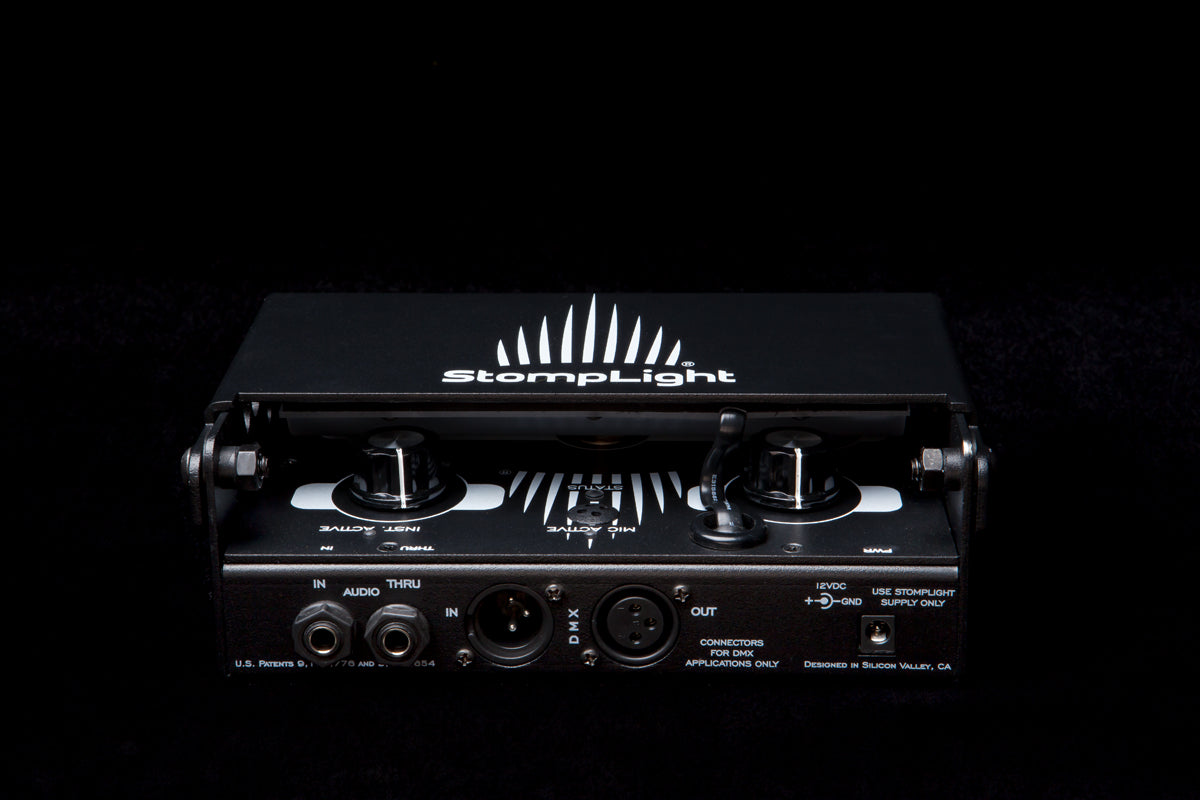 - Instrument Input / Color Organ Mode - You can plug in an electric guitar, bass guitar, keyboard, microphone, metronome or even a mixer into StompLight's 1/4" inputs. From there adjust the gain of the input using the Gain Knob and off you go generating sound active lighting. This mode incorporates our patented 7-band spectrum analyzer producing different color & frequency combinations of lighting effects.